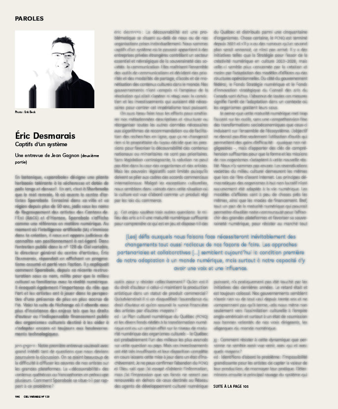 Jean Gagnon, « Éric Desmarais, Captifs d’un système / Caught Up in the System », Ciel variable, nº 129, « D’un continent à l’autre », Montréal, 2025, p. 103-106.