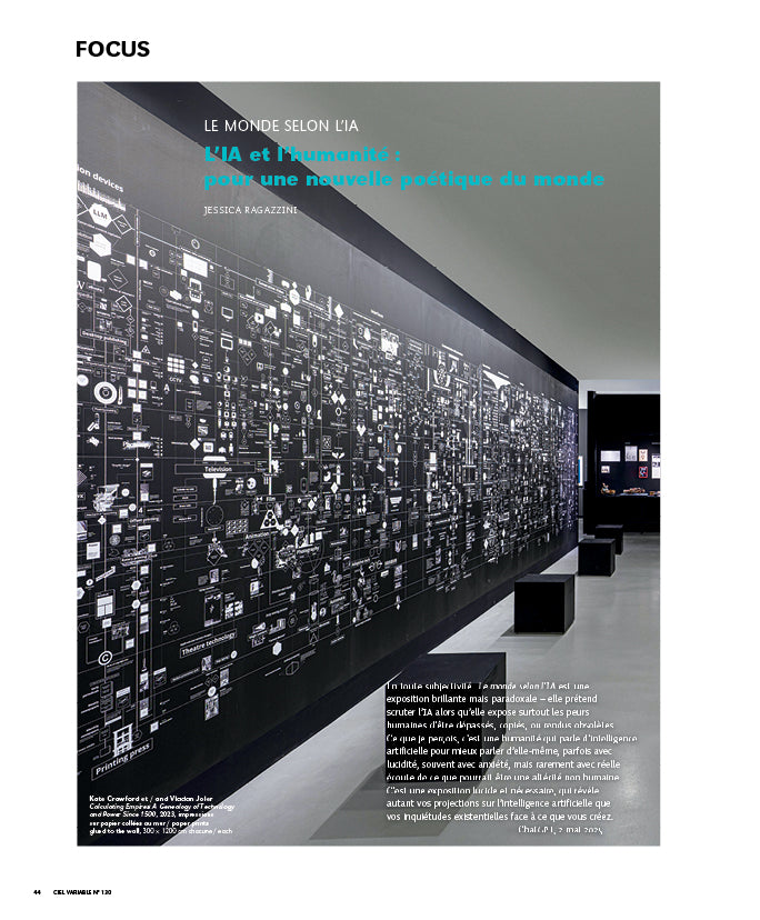 L’exposition Le monde selon l’IA proposait une exploration des rapports entre l’intelligence artificielle et la création. Tout en commentant le travail des artistes, qui se positionnent « avec, contre ou encore pour l’emploi de l’IA », Jessica Ragazzini fait le point sur cette nouvelle réalité. Sa réflexion sur « ce que nous sommes prêts à leur reconnaître [aux machines] comme pouvoir d’énonciation » l’a même incitée à demander à une entité algorithmique de porter un jugement sur l’exposition.