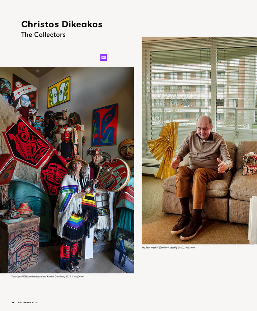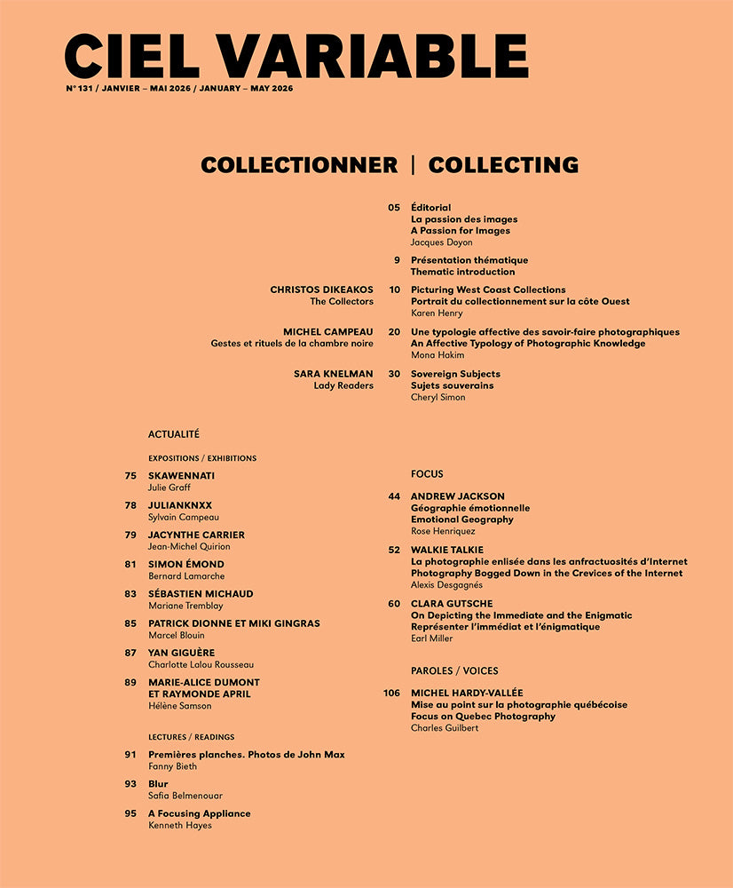 Le dossier thématique de ce numéro, intitulé Collectionner, réunit des séries d’artistes et d’une écrivaine — Christos Dikeakos, Michel Campeau et Sara Knelman. Leur travail nous permet de découvrir des portraits de collectionneurs, des archives qui rendent hommage aux pratiques de la chambre noire et un siècle d’images de femmes en train de lire, révélant l’importance des gestes, savoirs et engagements qui façonnent et diffusent la culture.
